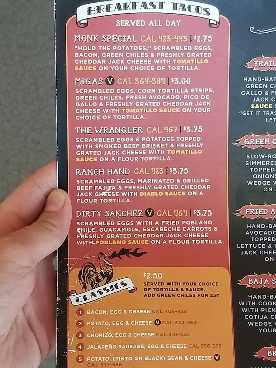 Cage-free eggs, refried pinto beans, crispy potatoes, chorizo, Green Chile Queso, mixed cheese, wrapped in a flour tortilla with a side of roja salsa and tomatillo sauce. Contains: Eggs, Milk, Soy, Wheat.
